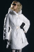 Снежно-белый удлиненный пуховик с запахом и поясом в цвет изделия, оптом.