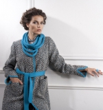Шерстяное пальто оригинального дизайна, рукава, горловина, полочка и низ изделия обработаны кантом из бирюзового трикотажа, оптовая продажа.