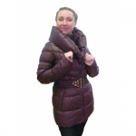 Женский пуховик насыщенного шоколадного оттенка с поясом, украшенным оригинальной пряжкой. Оптом.