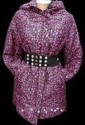 Женская куртка сиренево-розового цвета, с восточным принтом и широким эластичным поясом. Продажа оптом.