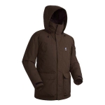 Темно-коричневый мужской пуховик прямого кроя с логотипом производителя на груди, оптом.